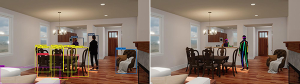同样的家居场景也可用于训练CV模型以用来检测人类,我们可在模拟中加入3D人体模型,并随机化其姿势、身高、身材、头发、皮肤等。这些CV模型可用于监测人的体态,并检测异常的步态和灵巧度等。如果住户在特殊位置或卧榻以外的地方跌倒或长时间不动,则系统也可以向应急服务机构发出警报。同样地,CV模型还能学习人在服药时的肢体和手臂动作,在用户忘记服药时发出提醒。