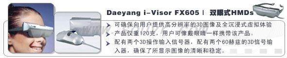 Daeyang生产的i-Visor FX605具有800x600(144万像素)SVGA级分辨率,可清晰地显示各种文字、图片及视频图像,能为PC用户和游戏玩家提供沉浸式、超真实的立体影像。该产品为便携式平台,其3D显示性能可确保向用户提供高分辨率的3D图像及全沉浸式虚拟体验,可广泛应用于游戏、娱乐及日常工作。