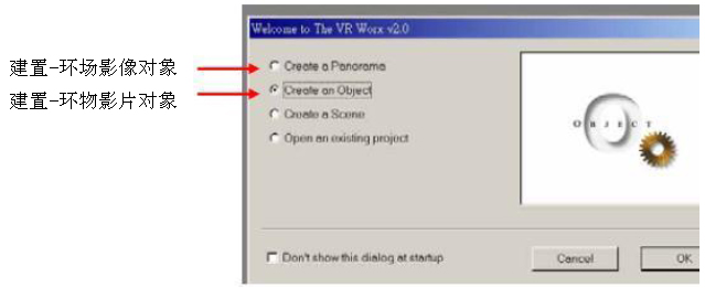 1. 打开其应用程序先跳出一窗口,让用户选择是要制作环物影片或是环场图像文件,请于此选择Creat an Object﹝建置一环物影片对象﹞。