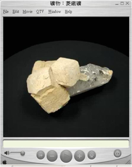 VR Toolbox 之The VR Worx 制作软件处理,转出输出成环物影片MOV 文件,所制作之对象,可使观赏者从各种不同垂直及水平转一圈,每次以固定角度转动拍摄一张照片,即可让VR 制作软件根据这些照片来制作产生对象影片了,透过quick time 拨放软件即可看到环物影片档,于此环物影片文件中透过鼠标的操控使观赏者从不同的角度欣赏此环物影片档,下图是本计划之地质学典藏数字化计划-矿物学子计划运用此技术于该子计划中。